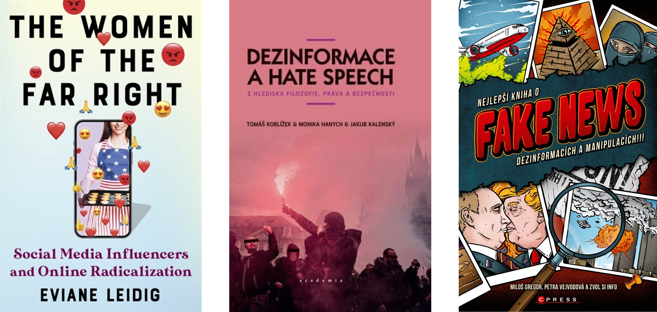 Proč si ji přečíst: Odhaluje, jak ženy z krajní pravice proměňují sociální sítě v nástroje radikalizace, zatímco ukazují sledujícím životní styl, který působí autenticky a přitažlivě. Nabízí fascinující vhled do genderově vyhraněného marketingu politických přesvědčení a pomáhá pochopit i umět odhalit tento fenomén. - Dezinformace a hate speech: Z hlediska filozofie, práva a bezpečnosti, Tomáš Koblížek, Monika Hanych, Jakub Kalenský (2025, Academia)